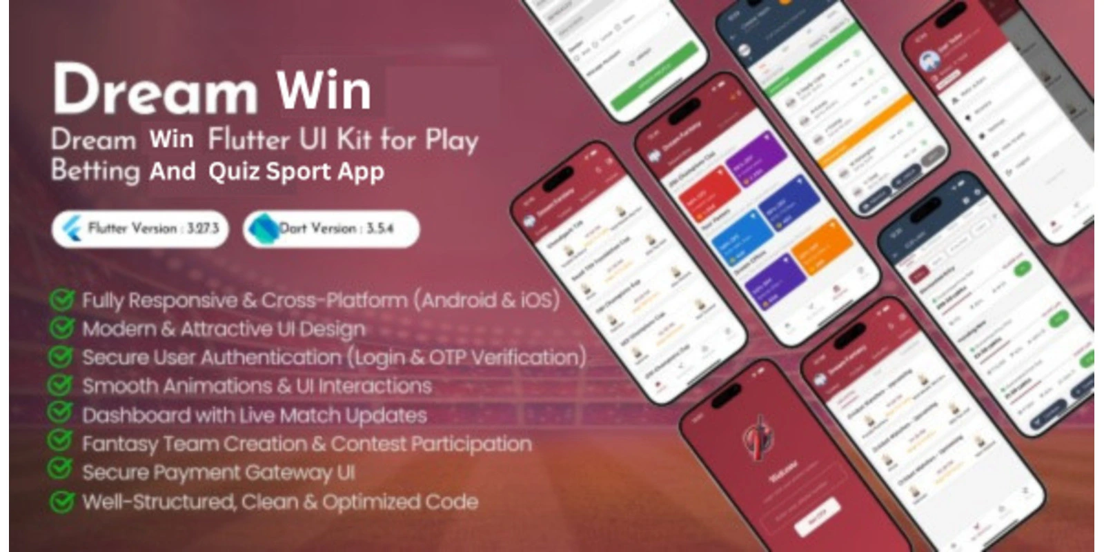 Dream Win is a professionally designed, modern, and fully customizable Flutter UI Kit for creating a Sports Betting and Quiz Mobile Application. Built with Flutter 3.27.3, this UI kit ensures a seamless and engaging user experience with a clean, responsive, and minimalistic design. It provides developers with a robust foundation for quickly building high-quality betting and quiz apps