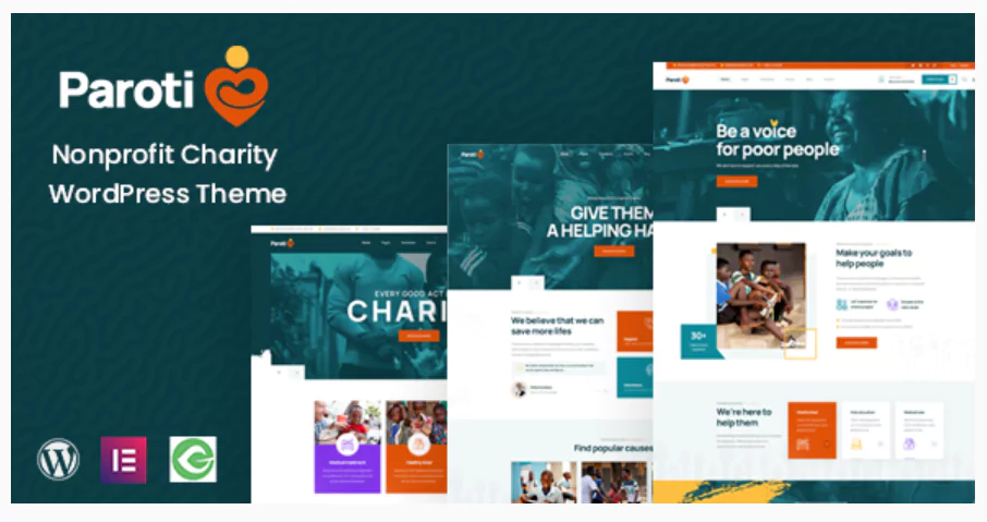 Paroti is the Nonprofit Charity WordPress Theme. It is clean, super flexible, fully responsive, pixel perfect, modern and comes packed with powerful options. Paroti is a clean professional WordPress theme which fits for all kind of charity, fundraising, nonprofit, NGO, donations, church, Mosque and all other non-profit charity website, businesses and NGO. The theme has its own super powerful theme control panel with lots of useful options and tools to manage your site: Elementor Page Builder, Revolution Slider, Custom Icon Font, etc. and the theme apply the latest web technologies: Bootstrap 5, SASS, HTML5, CSS3, Font Awesome … Check the demos to see by yourself.