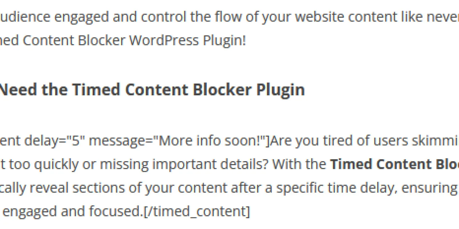 Are you tired of users skimming through your content too quickly or missing important details? With the Timed Content Blocker, you can strategically reveal sections of your content after a specific time delay, ensuring your visitors stay engaged and focused.